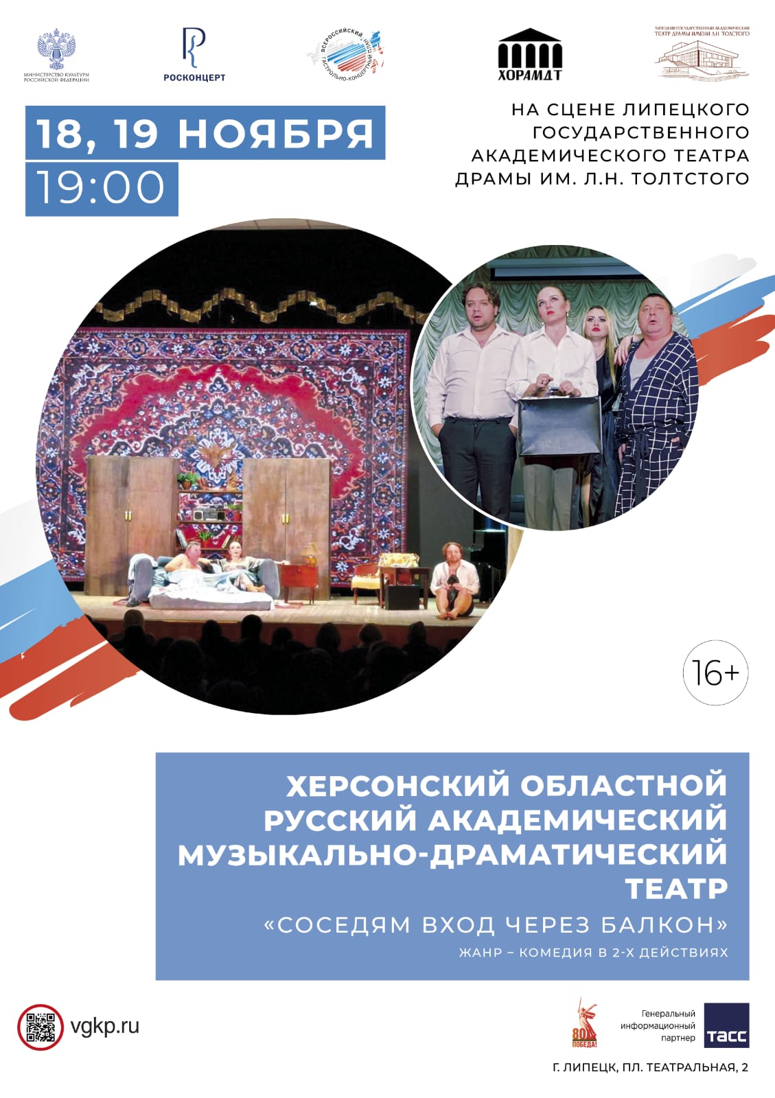 "Соседям вход через балкон" 16+Впервые на нашей сцене выступит Херсонский областной русский академический музыкально-драматический театр. Показы спектакля 18 и 19 ноября «Соседям вход через балкон» пройдут при поддержке Росконцерта в рамках реализации Всероссийского гастрольно-концертного плана «Мы - Россия». Мы осознаем всю значимость этого проекта и нашу ответственность. Для наших коллег сейчас домом является автобус и чужие гостиничные номера. Мы готовимся к встрече друзей из Херсона с особым трепетом и приглашаем всех зрителей поддержать этот замечательный коллектив.