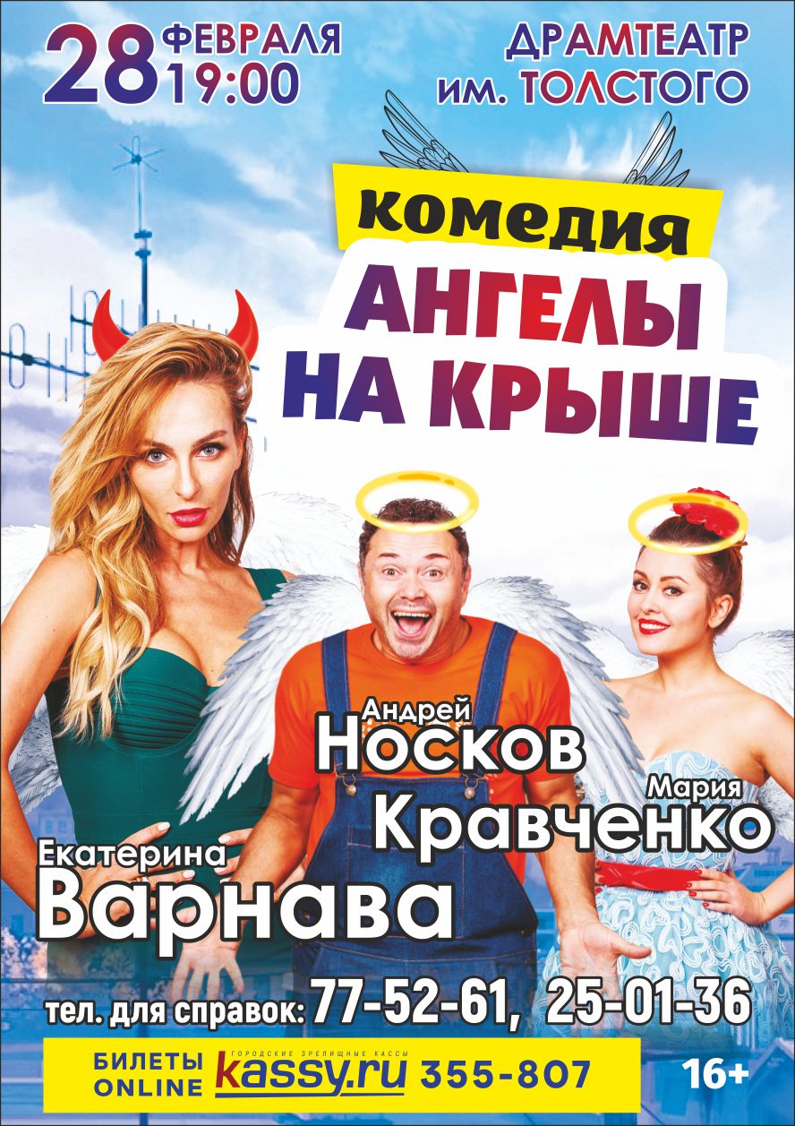 "АНГЕЛЫ НА КРЫШЕ" 16+Когда теряется смысл жизни, то она иногда приводит на крышу высотного дома где и должно все закончится. Но неожиданная встреча перед прыжком вниз круто изменяет жизнь главной героини Кати. Как оказалось даже в этом трагическом проступке может быть скрыто много смешного и забавного. Катерине дается еще один шанс начать жизнь с начала и она хватается за это предложение судьбы. Но как оказалось у неё еще много сюрпризов для героев этой пьесы. Но вместе, объединившись они преодолевают все трудности. Делают они это эмоционально, шумно и конечно смешно. Тем более что актеры приглашенные на эти роли и сами являются воплощением юмора. Мария Кравченко, Екатерина Варнава, Андрей Носков. |