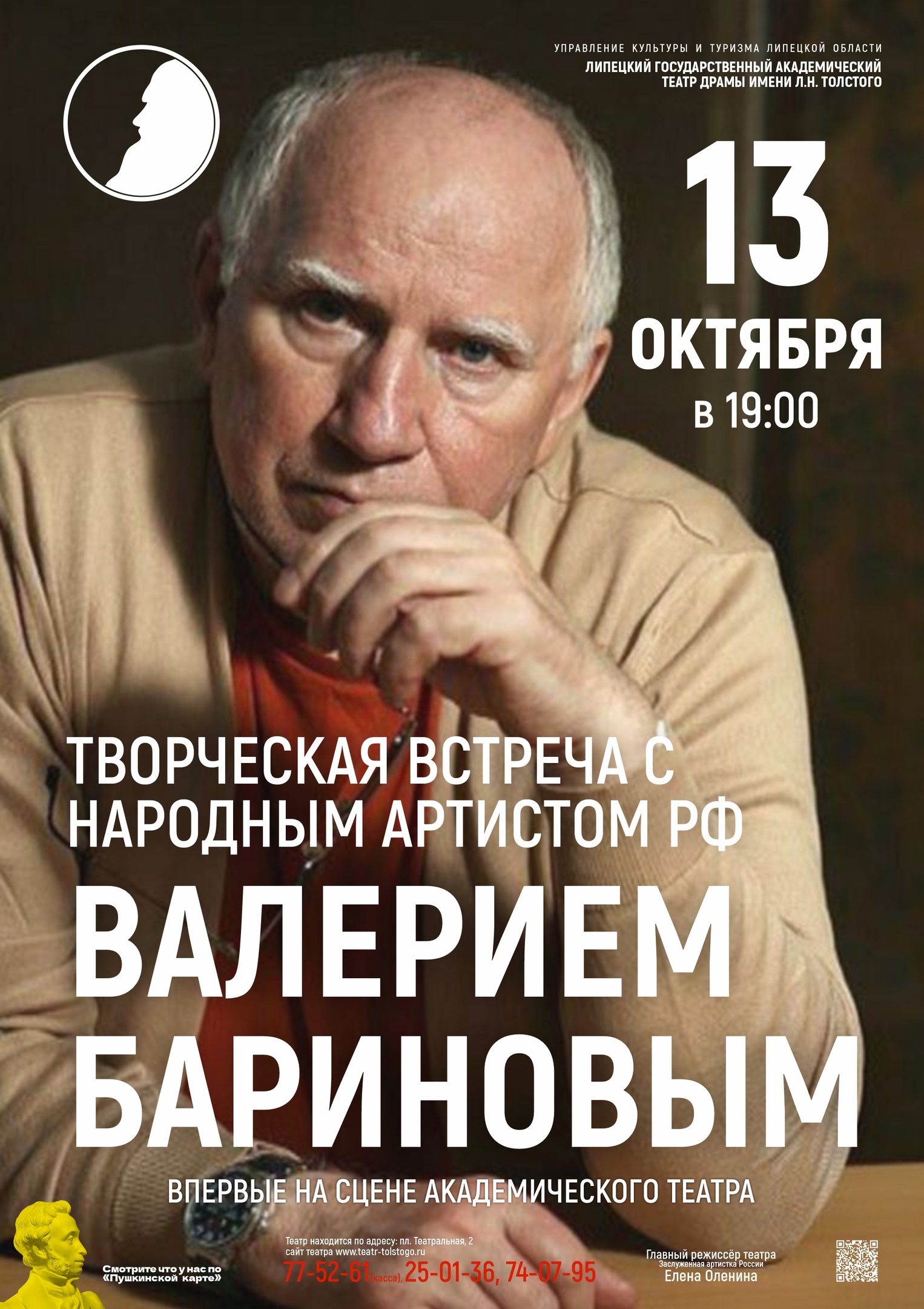 Творческая встреча с Валерием БариновымВалерий Баринов — народный артист Российской Федерации, советский и российский актер театра и кино. За собственную карьеру актер снялся в более чем 200 кинокартинах. Причем актер не придерживается одного определенно выраженного амплуа, постоянно меняется до неузнаваемости.