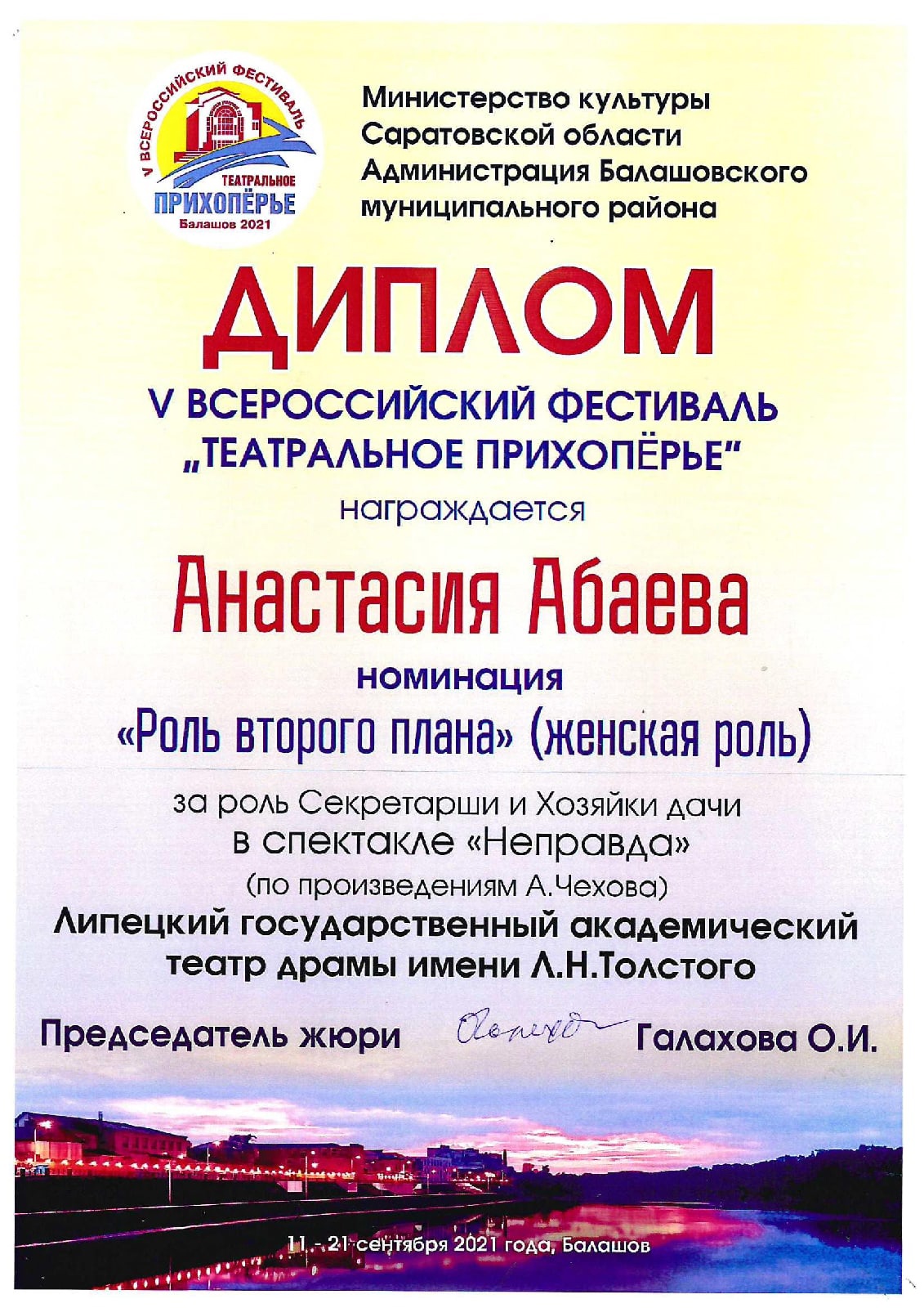 21 сентября на церемонии закрытия V Всероссийского фестиваля "Театральное Прихопёрье" в городе Балашов Саратовской области назвали имена лауреатов. Жюри отметило спектакль «Неправда» по рассказам А.П.Чехова Липецкого государственного академического театра драмы им.Толстого. Артистка Анастасия Абаева, создавшая в этой постановке образы Секретарши и Хозяйки дачи, объявлена победительницей номинации «Роль второго плана».