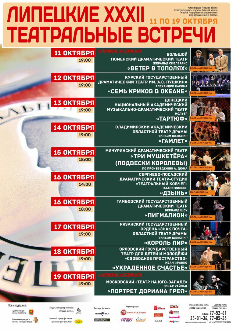 Дорогие друзья! 11 октября стартует Международный театральный фестиваль "ЛИПЕЦКИЕ ТЕАТРАЛЬНЫЕ ВСТРЕЧИ" Мы подготовили интереснейшую программу, в основе которой классика зарубежной драматургии — от Шекспира до Бернарда Шоу! Спешите приобретать билеты! На часть спектаклей мест уже нет.