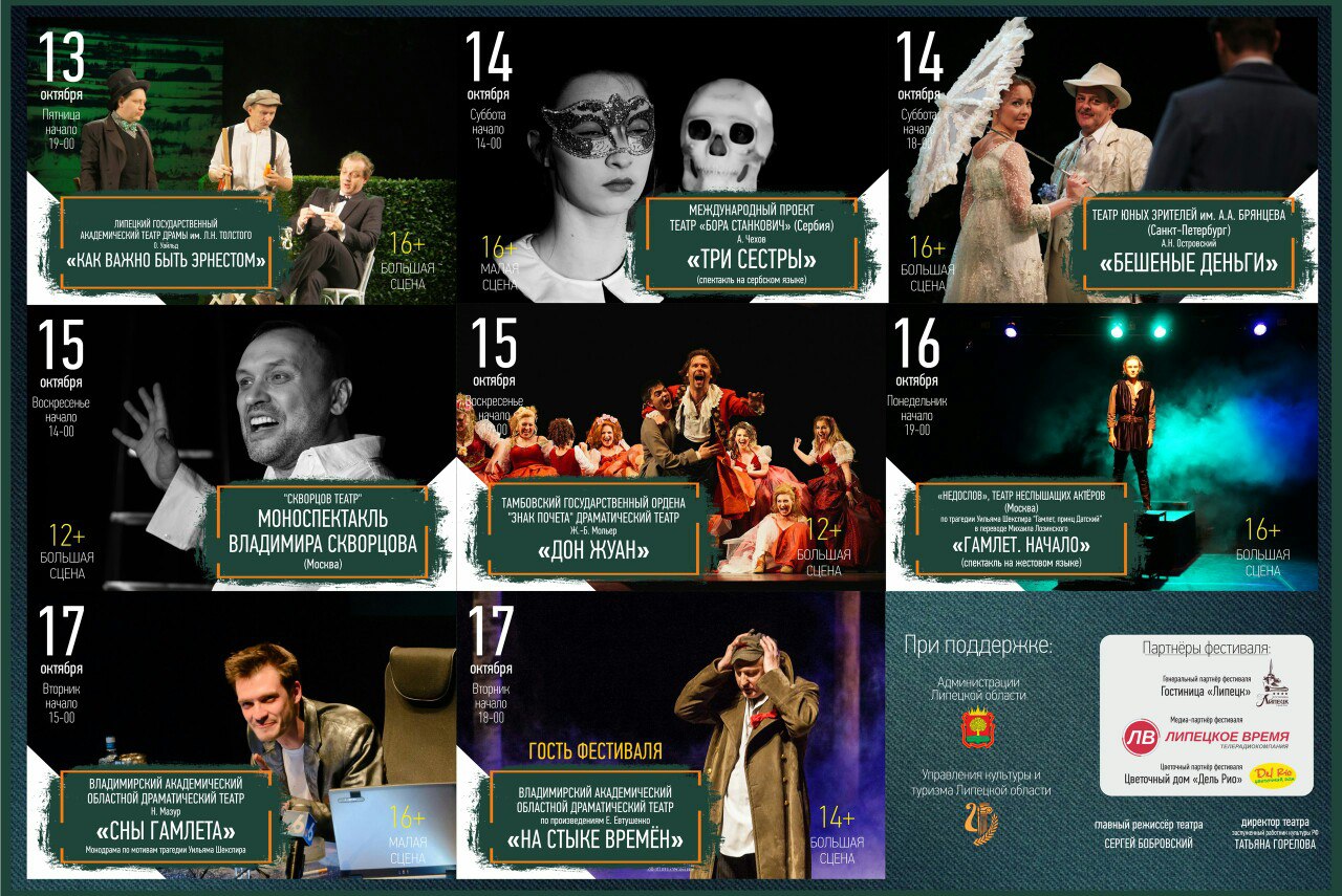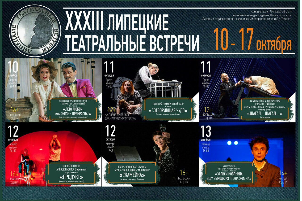 С 10 по 17 октября в Липецком академическом театре пройдёт 33-й Международный театральный фестиваль «Липецкие театральные встречи». Тема фестиваля в этом году – «Классика +» - название даёт направление – от безусловной классики до современной её трактовки и современной драматургии. Широка география фестиваля – выступят на липецкой сцене коллективы из городов – Москва, С-Петербург, Владимир, Тамбов, подмосковный театр Музея Мелихово. В фестивале примут участие несколько иностранных театральных коллективов – из Германии, Сербии и Белоруссии. Липецкую область в этом году представят сразу два спектакля – спектакль-лауреат Конкурса-фестиваля профессиональных театров Липецкой области «Сотворившая чудо» Липецкого драматического театра (реж. Г. Балабаев) и премьера хозяина фестиваля – Липецкого академического театра им. Л. Толстого «Как важно быть Эрнестом» (реж. С. Бобровский). Состав экспертов жюри фестиваля тоже международный – председателем в этом году выступит Нина Мазур (Германия), а также Карине Ходикян (Армения), Анджелина Рошка (Республика Молдова), Александр Вислов (Россия, Москва) и Ольга Сенаторова (Россия, Москва). Полная афиша фестиваля – на сайте театра http://www.teatr-tolstogo.ru/afisha/festival/ и на сайте Культура.рф https://www.culture.ru/events/139684/mezhdunarodniy-teatralniy-festival-lipetskie-teatralnie-vstrechi