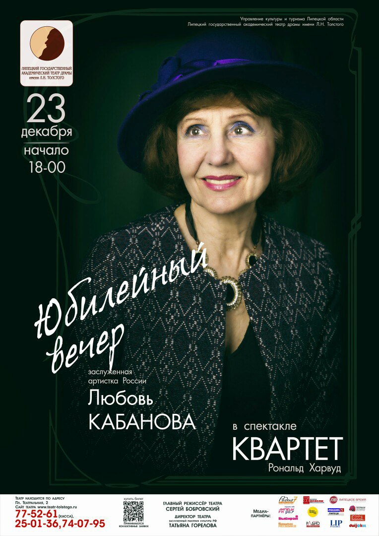 23 декабря — День Рождения заслуженной артистки РФ Любови Кабановой! Приглашаем на Юбилейный вечер актрисы, она сыграет одну из главных ролей в спектакле "Квартет".