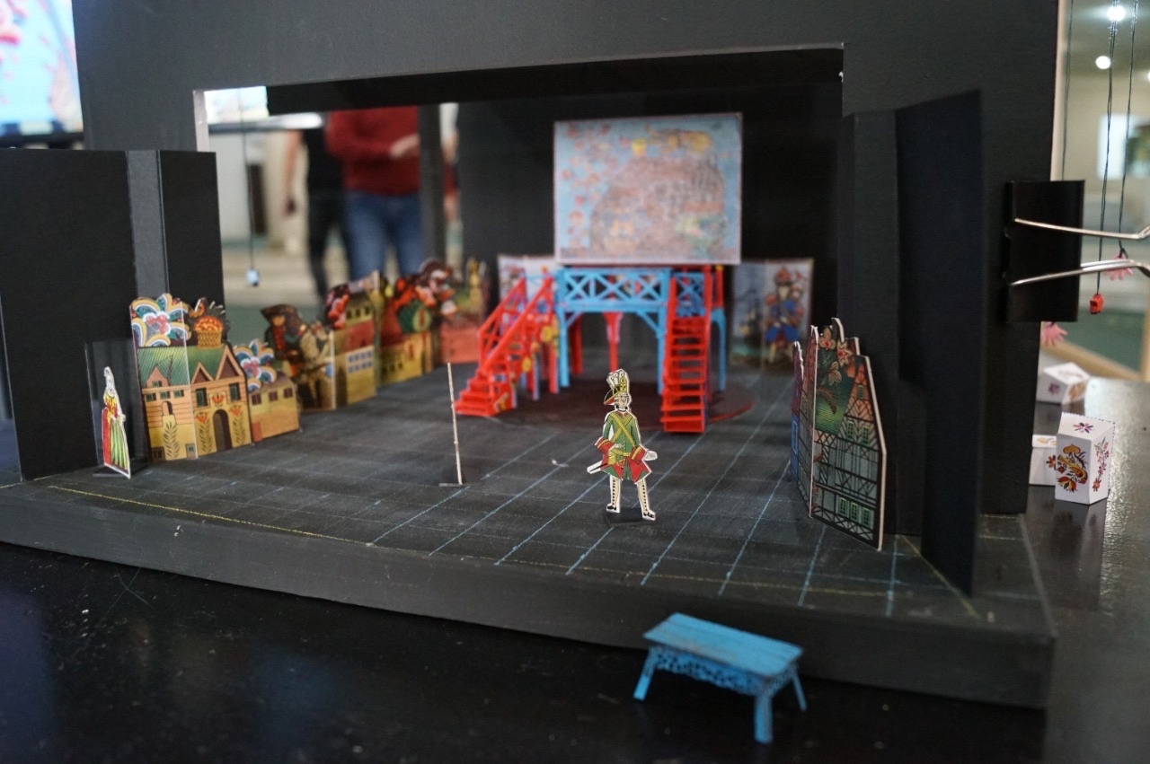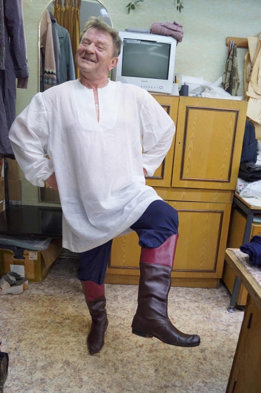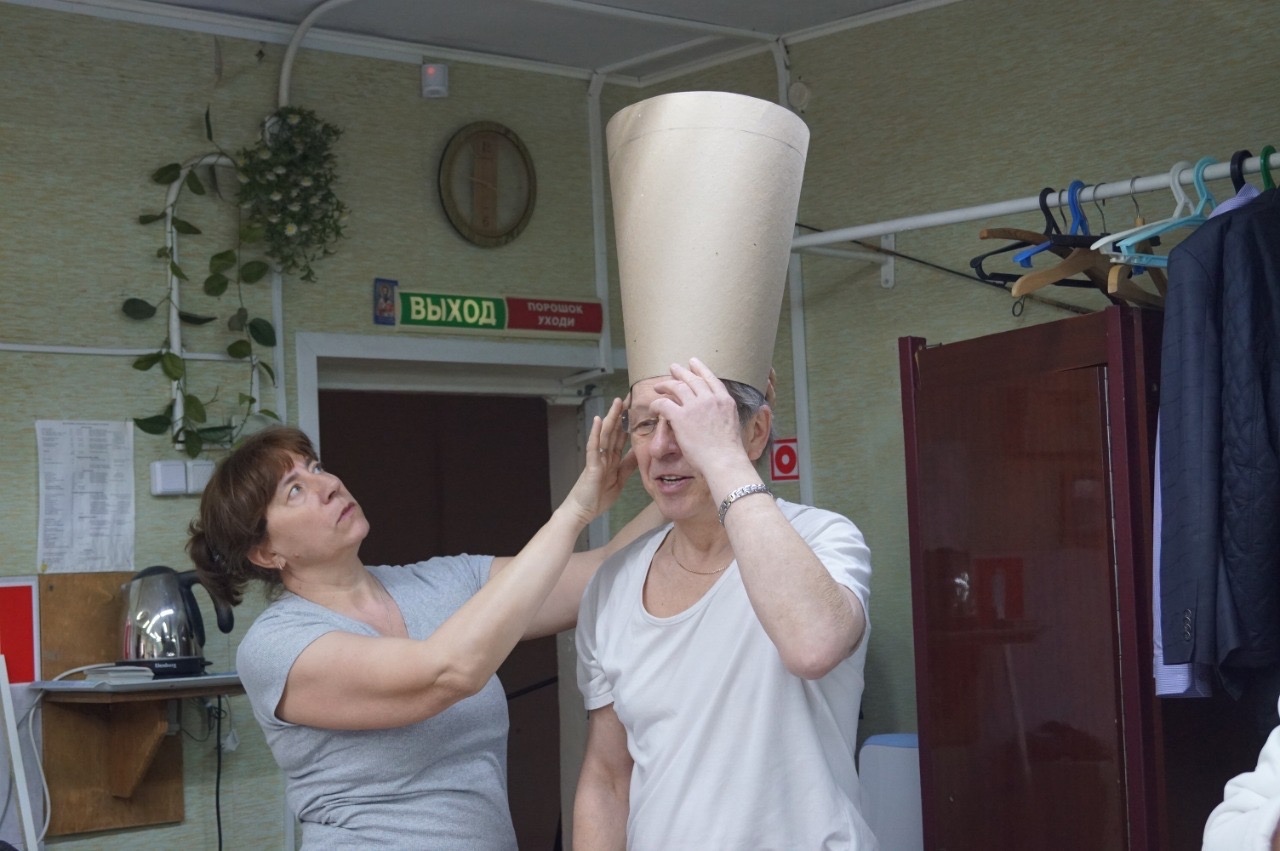 Успеть к юбилею — Постановка масштабная. Нам предстоит сшить костюмы для 29 основных персонажей, не считая массовки, — рассказывают работницы швейного цеха театра. — Костюмы украсим тесьмой, на них будут бархатные воротники, пуговицы, пряжки, бусы, каменья. Заказали 30 париков с кудрями, как носили в ту эпоху. Словом, объём работы очень большой. — А боярская шапка не слишком высоко сидит? — спрашивает у швей заслуженный артист России Владимир Кравченко. Те убеждают: всё по эскизу. Именно такие высокие головные уборы и были у русской знати в конце XVII века, до смены придворного костюма при Петре I. — А посмотрите, какая обувь, — кивает Владимир Александрович в сторону коллеги. Остроносые сапоги красного цвета ниже колена демонстрирует нам, покачиваясь с каблука на носок, актёр Вячеслав Михеев. — Красота! — заключают оба. От швеи до декоратора — все работают не покладая рук. Времени осталось мало — нужно успеть ко дню рождения Петра Алексеевича — до 9 июня. Россия и Европа